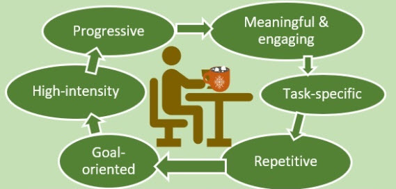 Task training is critical because it will ‘force’ you to practice using your more-affected limb. This is why the Evidence-Based Review of Stroke Rehabilitation (EBRSR) concludes that constraint induced movement therapy (CIMT) in clinical settings, for those who meet the qualifying criteria, shows strong evidence of benefit in comparison to traditional therapies in the chronic stage of stroke. CIMT is a great example of task training for the upper-limb. 30 to 66 % of stroke survivors report no longer being able to use the affected arm despite trying to rehabilitate and are in danger of avoiding using it (‘learned non-use’ or inattention/ neglect of the limb). Several factors might explain this phenomenon. First, you may see no reason to try and use your bad arm and therefore remain ignorant of underlying motor potential. Second, you may not know how to use any emerging isolated movement for functional performance.