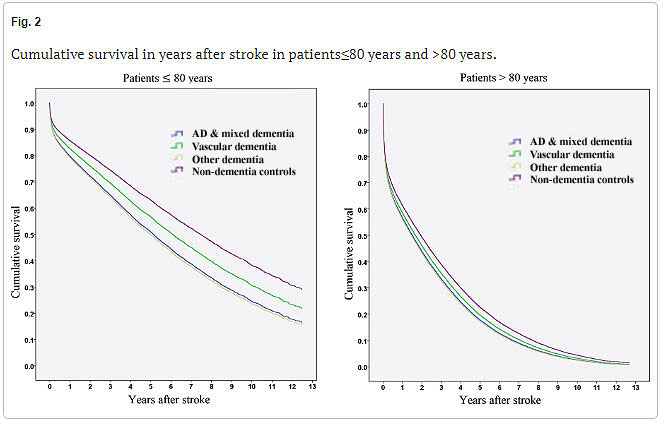12,629 ischemic stroke events in patients with dementia with matched 57,954 stroke events in non-dementia controls in different aspects of patient care and mortality. Patients with≤80 years with prior Alzheimer’s disease or mixed dementia showed higher mortality rates after stroke compared to patients with prior vascular dementia.